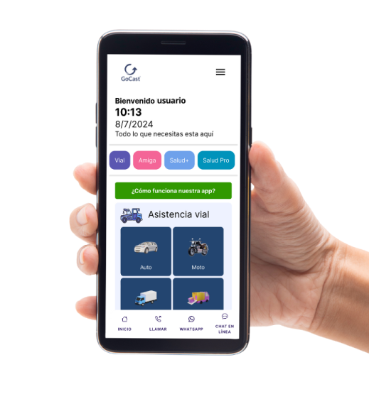 Con nuestra GoCast App podrás acceder fácilmente a múltiples servicios de asistencia a nivel nacional las 24 horas del día, los 365 días del año. Es accesible, cómoda y amigable, permitiéndonos ubicarte de manera inmediata y acompañarte en tiempo real para solucionar tus eventualidades.